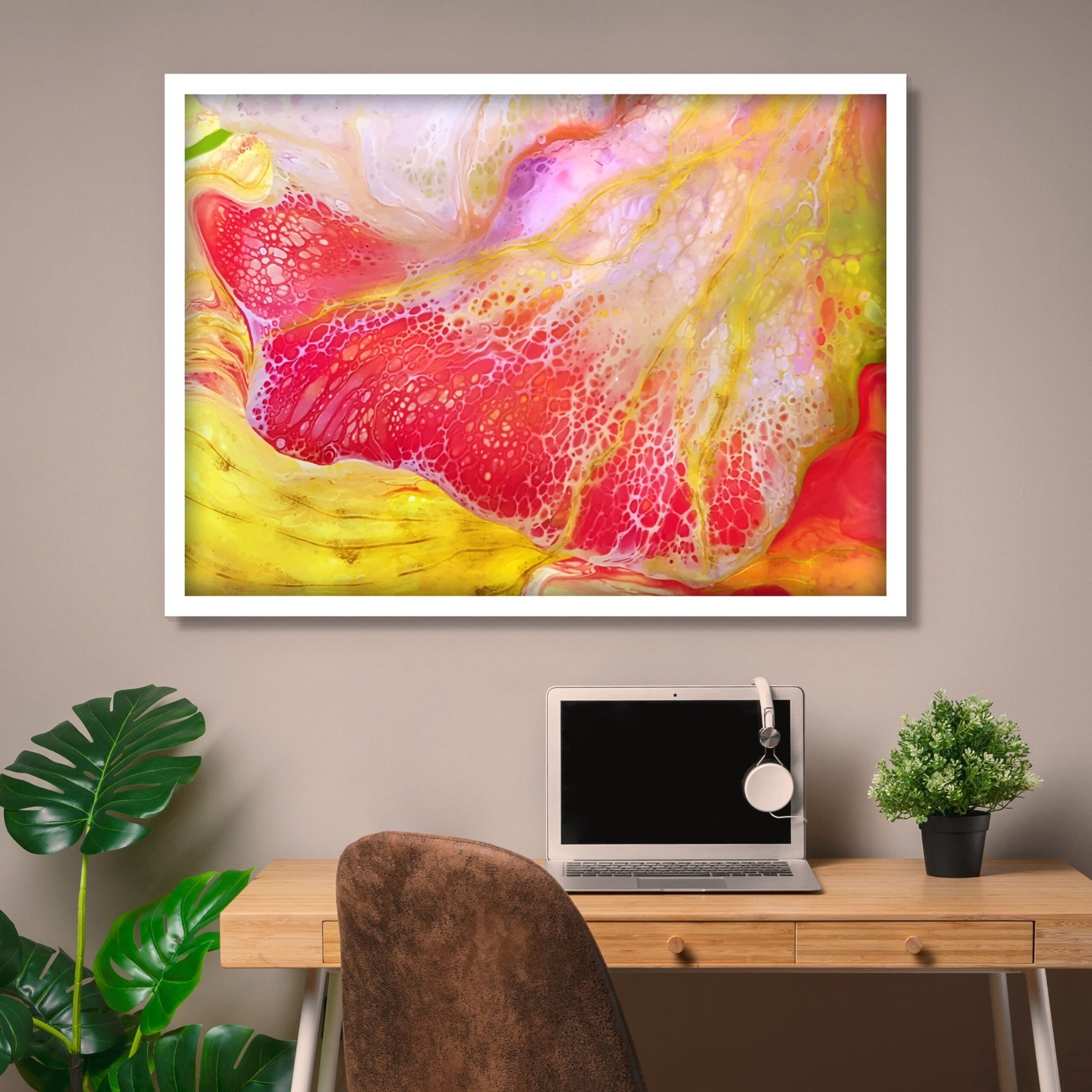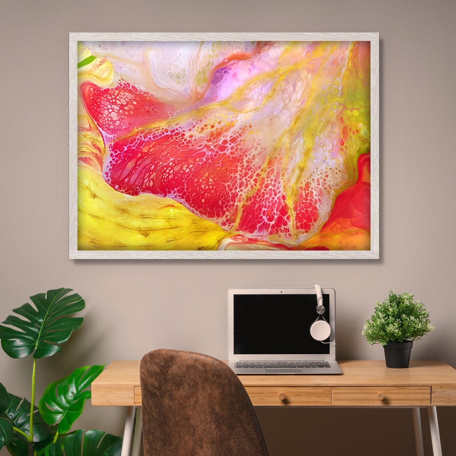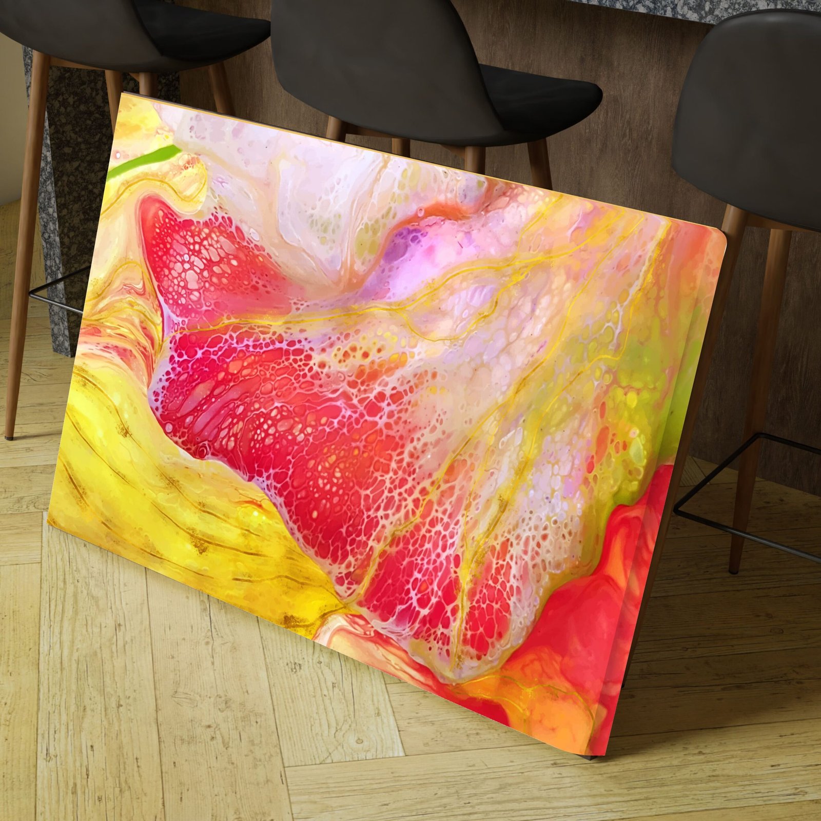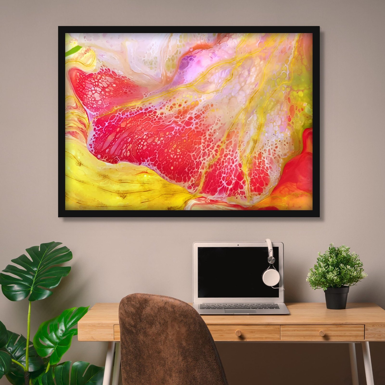 Este cuadro es un torbellino de formas abstractas y colores vibrantes se arremolinan en el lienzo, creando una sensación de movimiento y energía contagiosa. Los tonos cálidos y luminosos, como el rojo, el naranja y el amarillo, predominan en la composición, transmitiendo una sensación de optimismo y entusiasmo.
