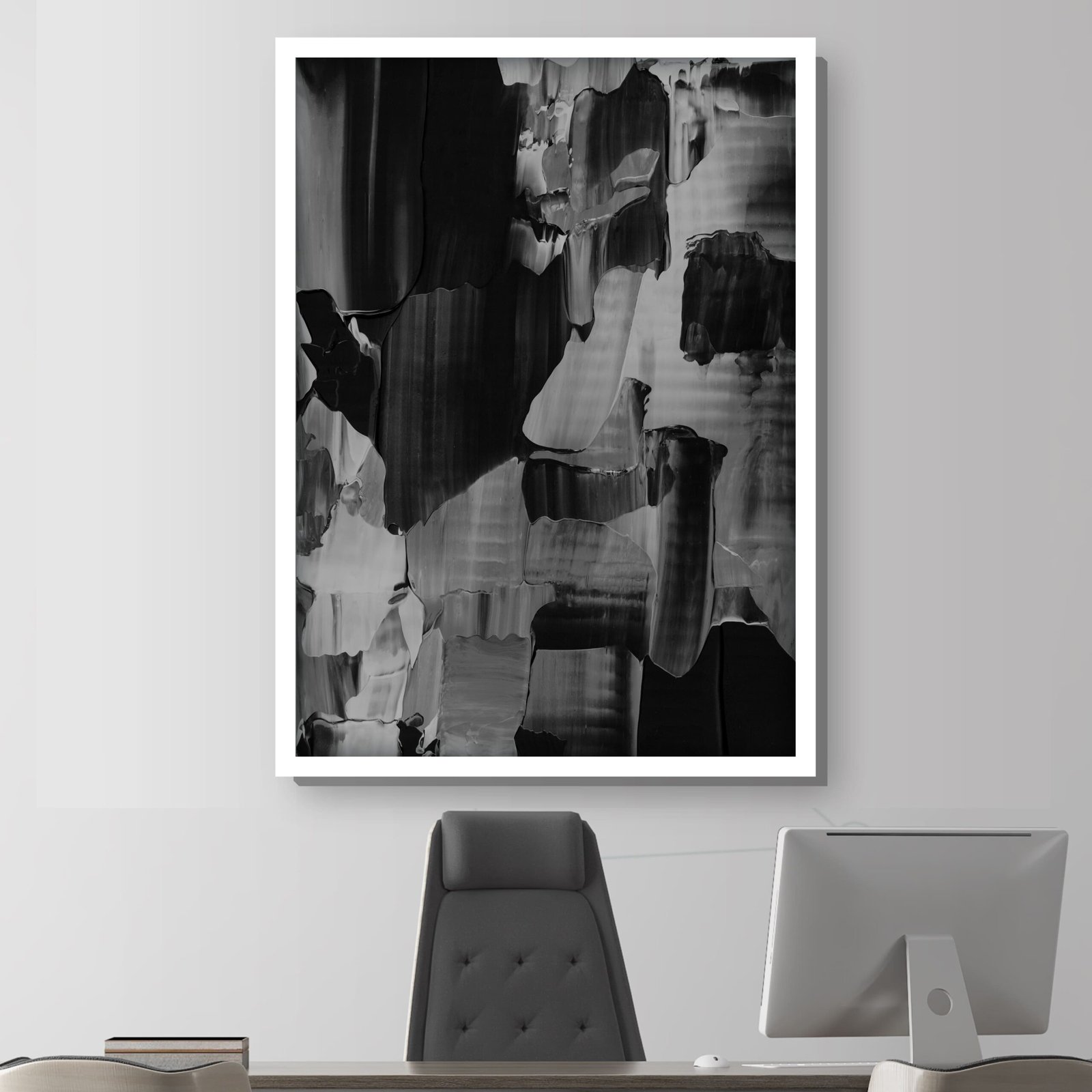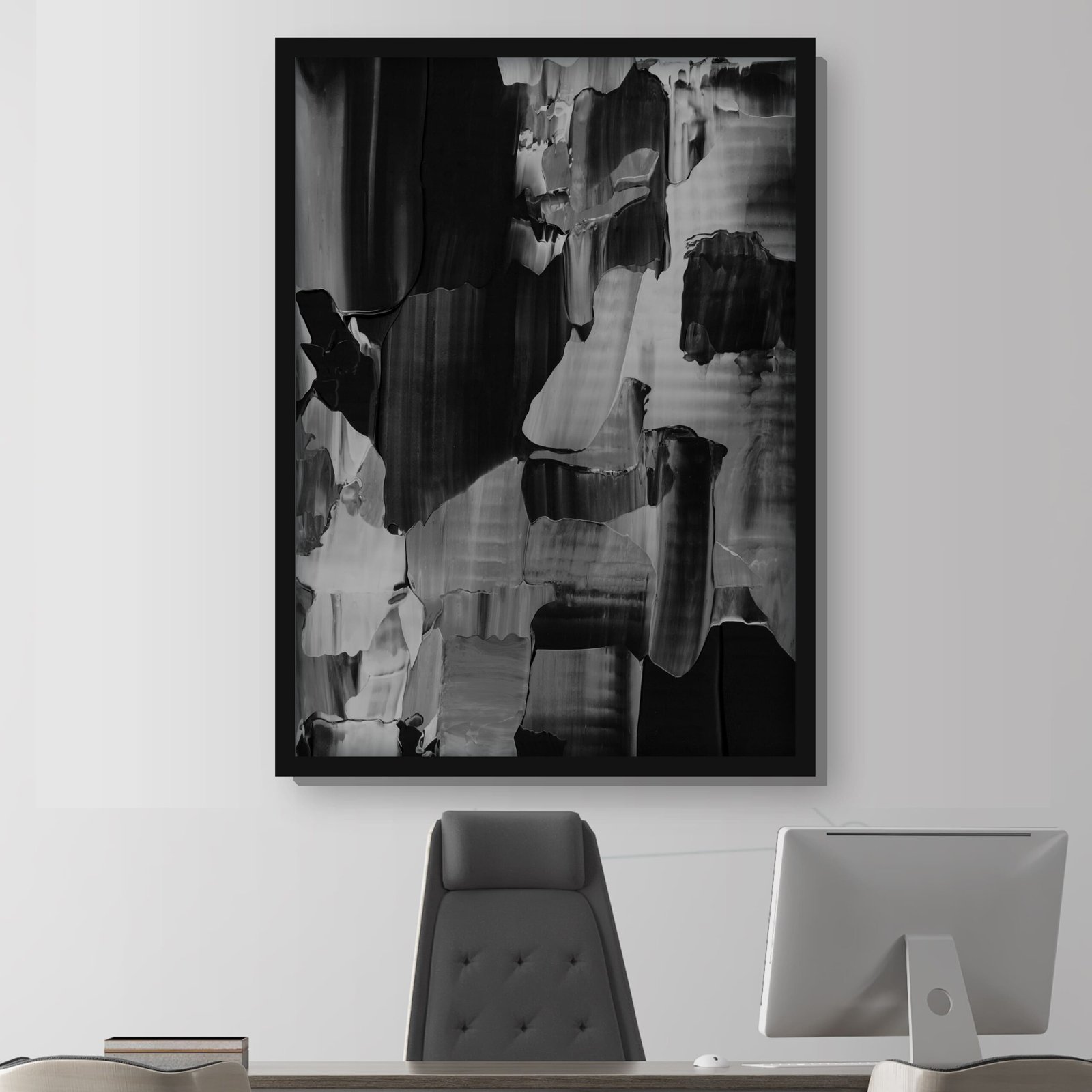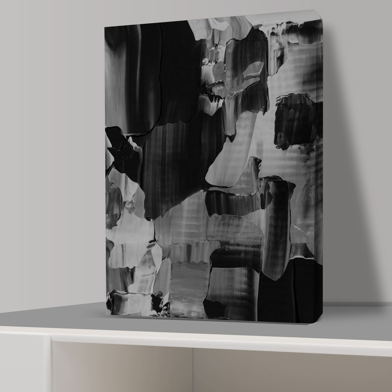 Explora la vanguardia del arte con nuestro Cuadro Pintura Abstracta Papel Tapiz, una obra impresa sobre lienzo que fusiona tonos grises y negros con una mezcla de colores desvanecidos. La composición presenta una interesante amalgama de tonalidades unicolores en negro, blanco y gris, creando una dinámica visual única.