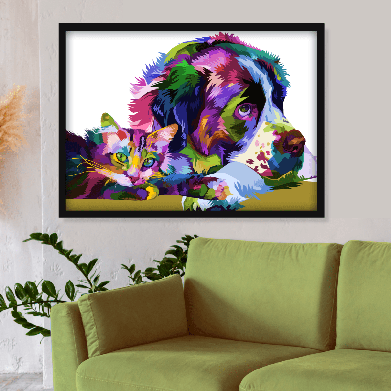 ¡Amistad colorida! La impresión muestra un perro San Bernardo y un gato, llenos de formas y colores vivos que crean una composición dinámica y con mucho movimiento. Los tonos intensos y contrastantes, como el rojo, azul, amarillo, violeta y verde, crean una atmósfera divertida y llena de energía.
