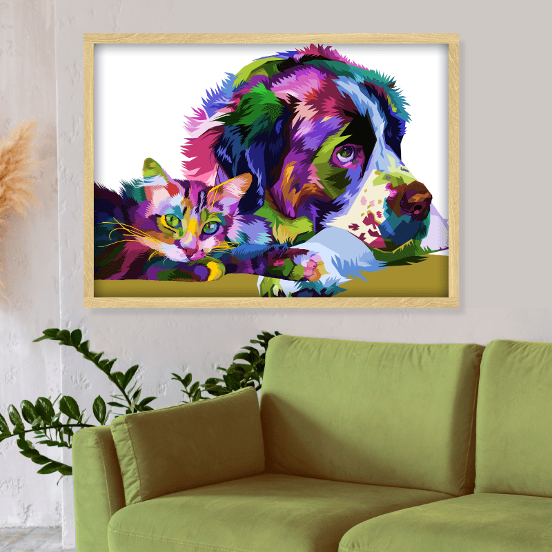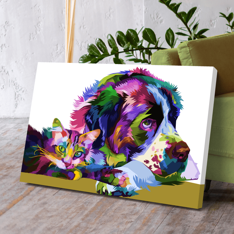 ¡Ternura! Esta impresión sobre lienzo es una explosión de color y alegría que llenará de vida cualquier espacio. El cuadro presenta a un perro y un gato, dos animales que no siempre se llevan bien, pero que en esta ocasión se muestran unidos y tranquilos.