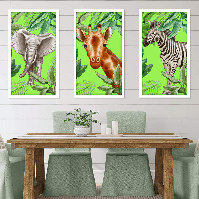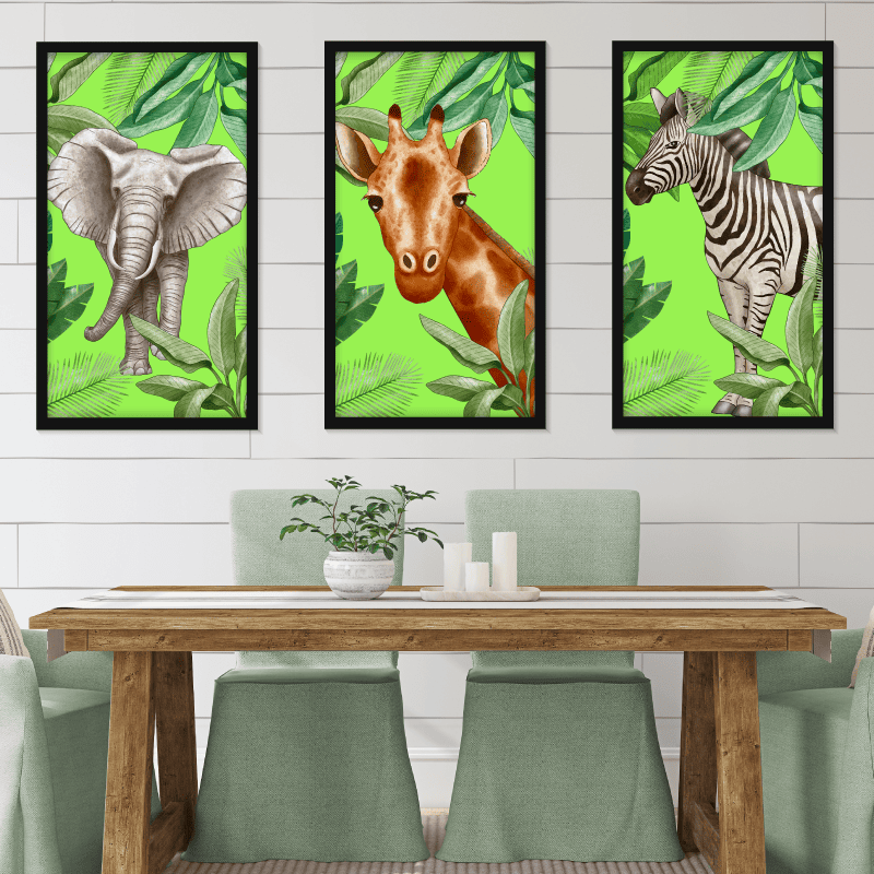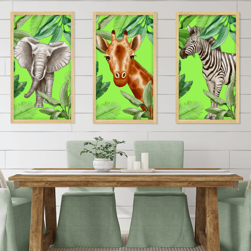 ¡Un viaje a la jungla! Déjate cautivar por la explosión de colores vibrantes que dan vida a este tríptico. Los verdes de la selva se mezclan con los tonos cálidos y neutros de los animales, creando una paleta que irradia energía y alegría. Estos hermosos animales son un recordatorio de la importancia de proteger la naturaleza y su biodiversidad de nuestro planeta.