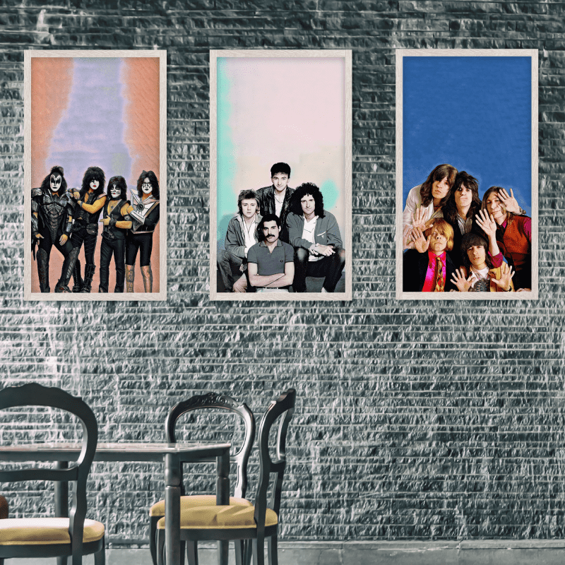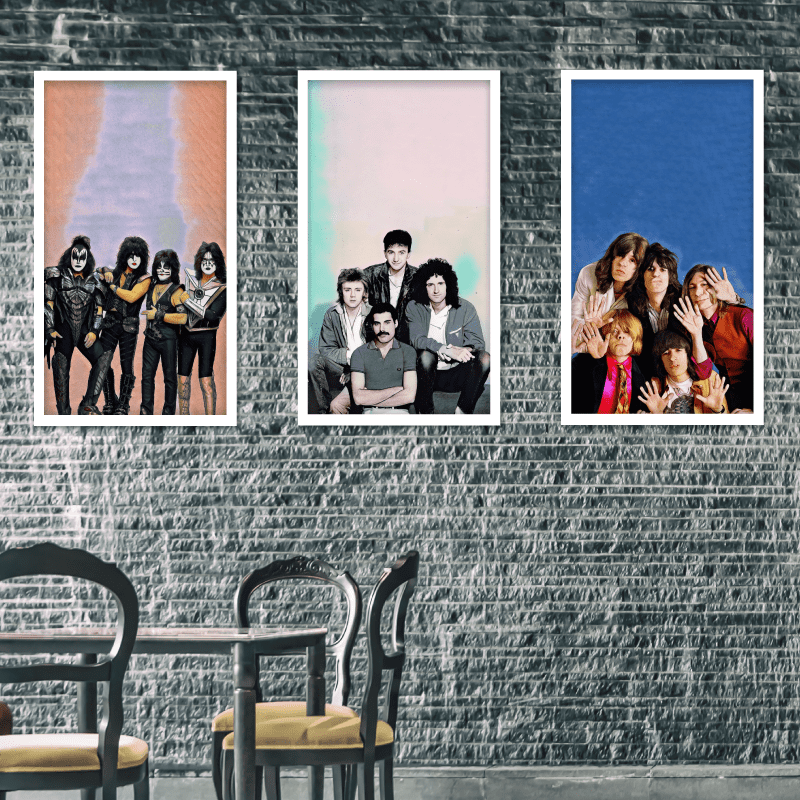 ¡Legendarias!  Estas impresiones sobre lienzo te invitan a un viaje a través de la historia del rock, con tres de las bandas más importantes y revolucionarias: Kiss, Queen y The Rolling Stones.