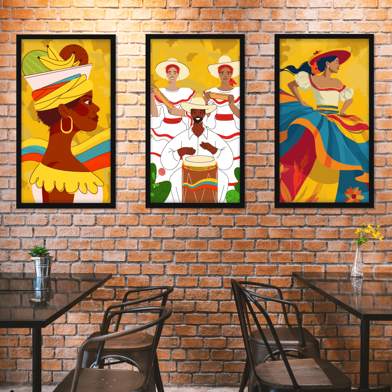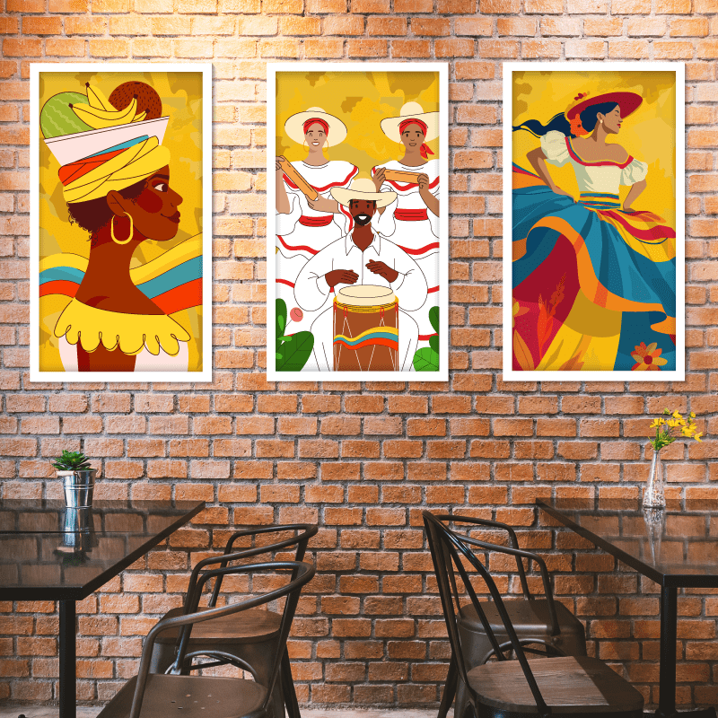¡Colombia!  A través de estas impresiones sobre lienzo llenas de alegría, ritmo y tradición, podrás conectar con la riqueza cultural de este país. Estos cuadros muestran un ambiente vibrante y colorido.