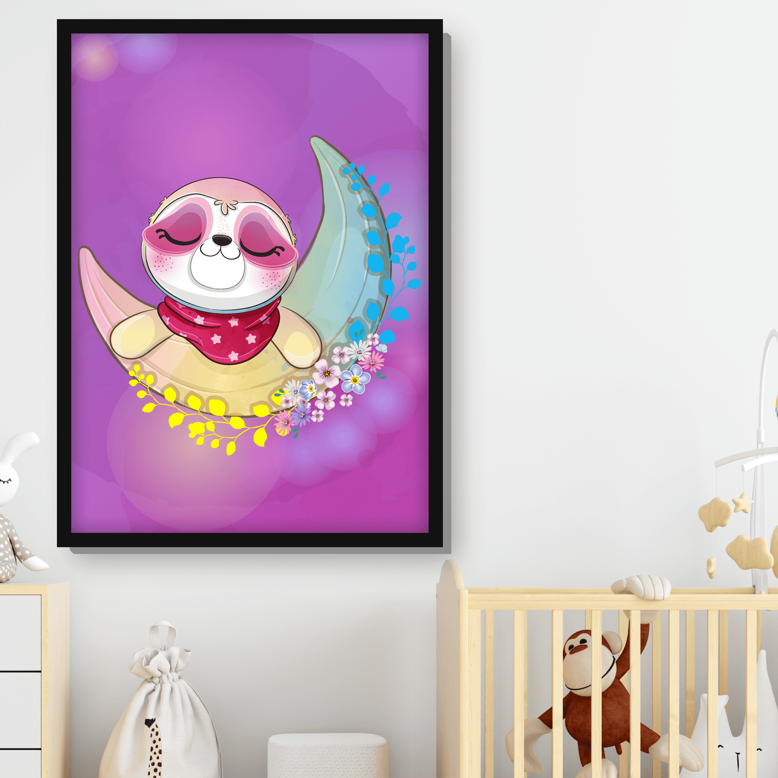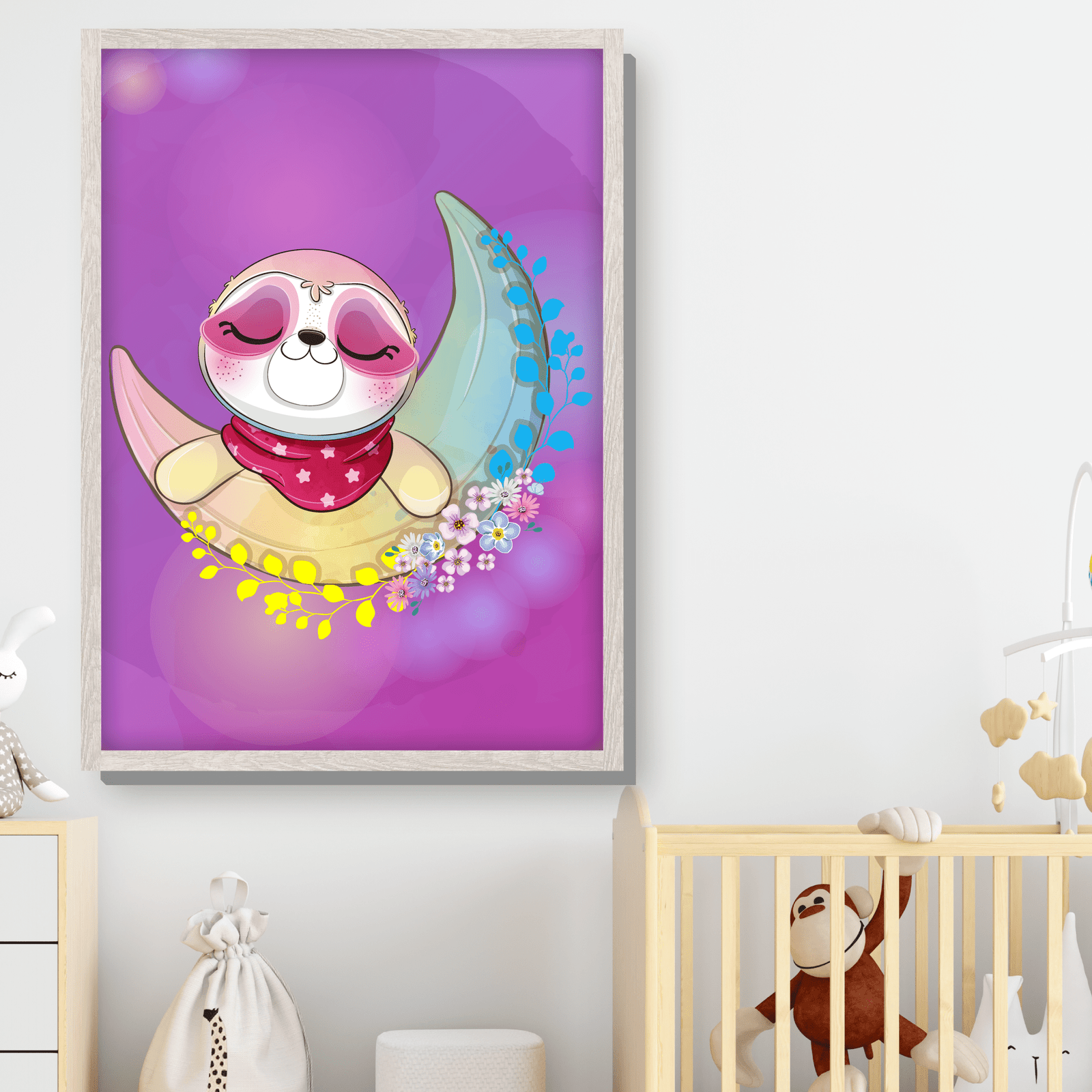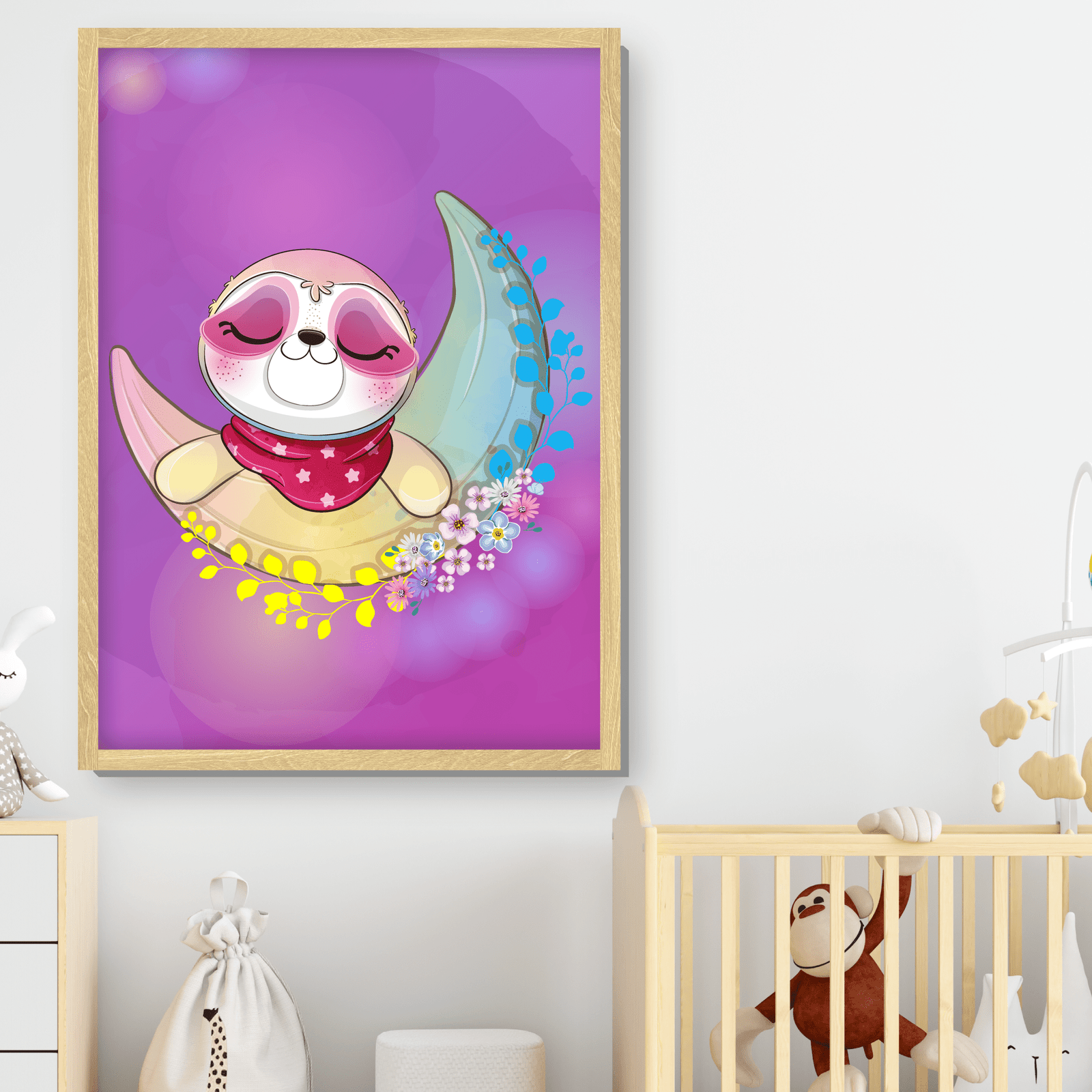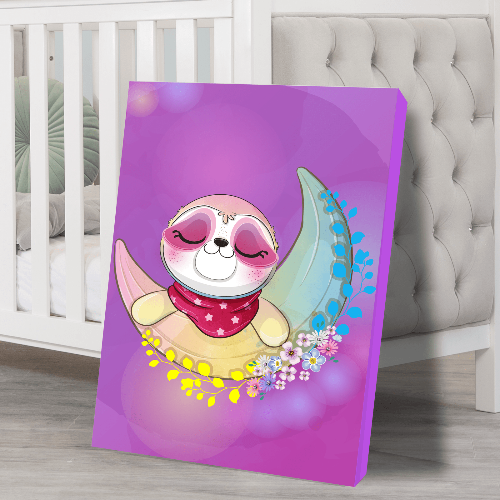 ¡La elección perfecta! Esta adorable impresión sobre lienzo presenta a un tierno oso durmiendo plácidamente sobre una luna creciente, rodeado de coloridas flores y hojas que le dan un toque de alegría y frescura a la composición.