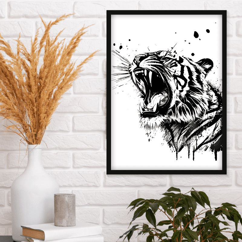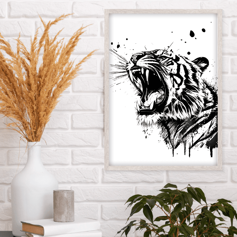 ¡Intensidad en la escena! La impresión presenta un primer plano de la cabeza de un tigre, con ojos penetrantes y un feroz rugido, mostrando sus afilados colmillos. El blanco puro del fondo realza la figura del tigre, mientras que los negros profundos acentúan su poder y su imponencia. La postura dinámica del animal, crea una sensación de movimiento y energía.