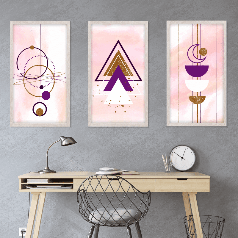 ¡Estructura y orden! El uso de líneas rectas, curvas y formas representa la magia y la armonía; mientras que el color dorado y el morado crean contraste y profundidad. El tríptico manifiesta libertad, invitando al espectador a interpretar y conectar con las piezas a su manera. Es una búsqueda de creatividad y expresión individual.