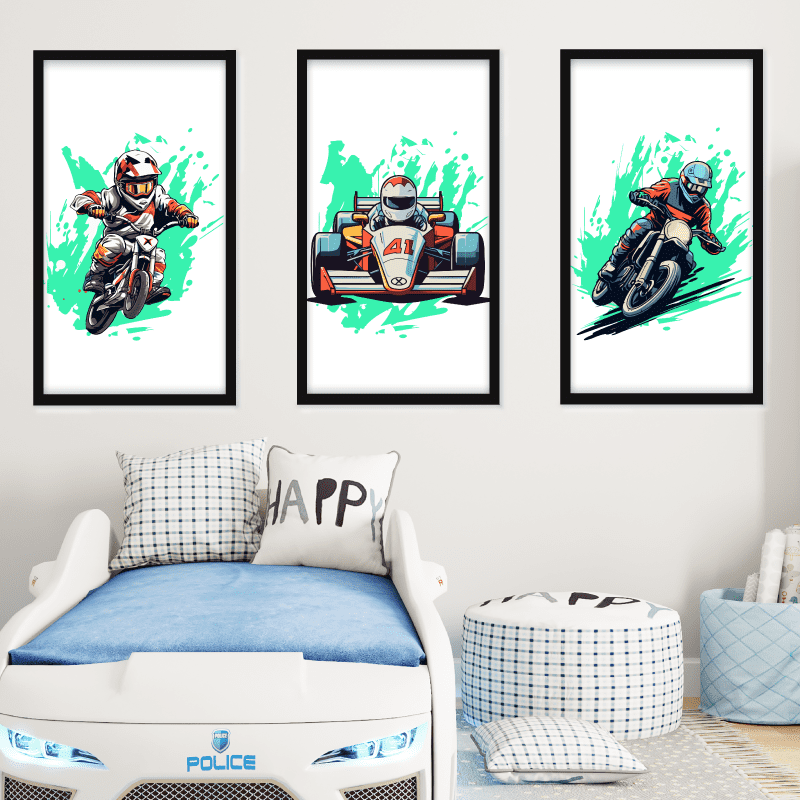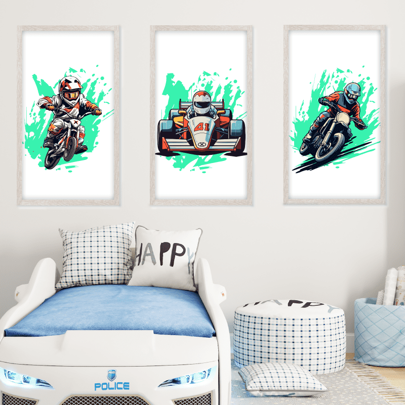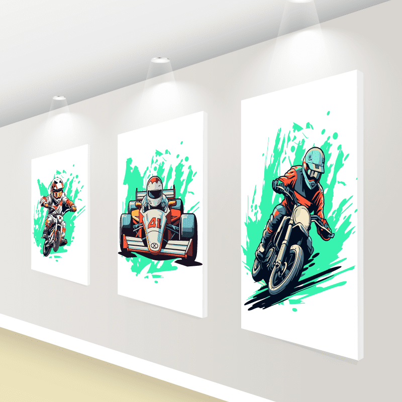¡Sumérgete en un viaje lleno de adrenalina! Estas impresiones sobre lienzo se unen como una invitación a la aventura. Con tres cuadros llenos de color y movimiento.