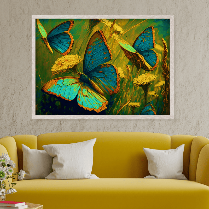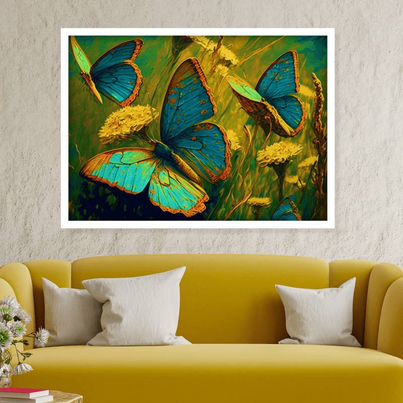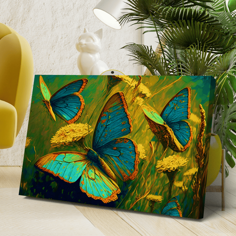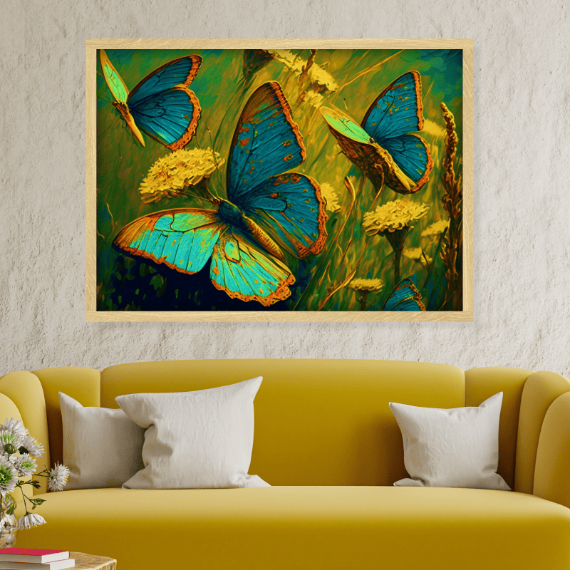 ¡Vitalidad! Esta impresión sobre lienzo transmite un mensaje de alegría, libertad y transformación. Las mariposas, símbolo de la metamorfosis, nos recuerdan que el cambio es parte de la vida y que siempre podemos florecer y alcanzar nuevas metas.