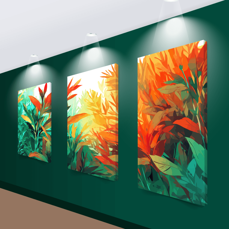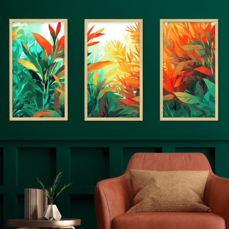 ¡Luminosidad! Los tonos verdes, amarillos, rojos y naranjas se mezclan de forma armoniosa, creando una atmósfera de alegría y vitalidad. Las formas de las hojas se deslizan por el lienzo con gracia y dinamismo. Cada línea y curva invita a la contemplación y despierta la imaginación. Estos cuadros son un canto a la vida y a la naturaleza, son un símbolo de crecimiento y renovación, recordando que siempre hay motivos para la esperanza.