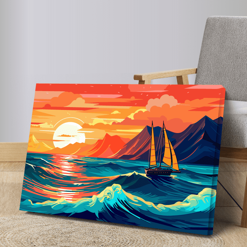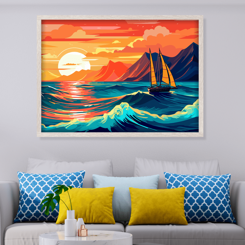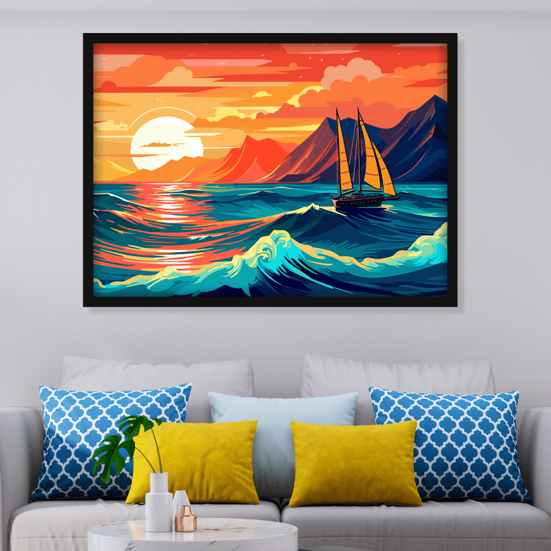 ¡Inspírate! En esta pieza predominan los tonos cálidos como el naranja y el amarillo, creando una atmósfera de calidez y optimismo; contrastando con el azul profundo del mar que añade un toque de serenidad y misterio. Esta impresión te brinda una sensación de movimiento y dinamismo; al igual que te invita a sentir la brisa marina en tu rostro y a escuchar el sonido de las olas rompiendo contra la costa.
