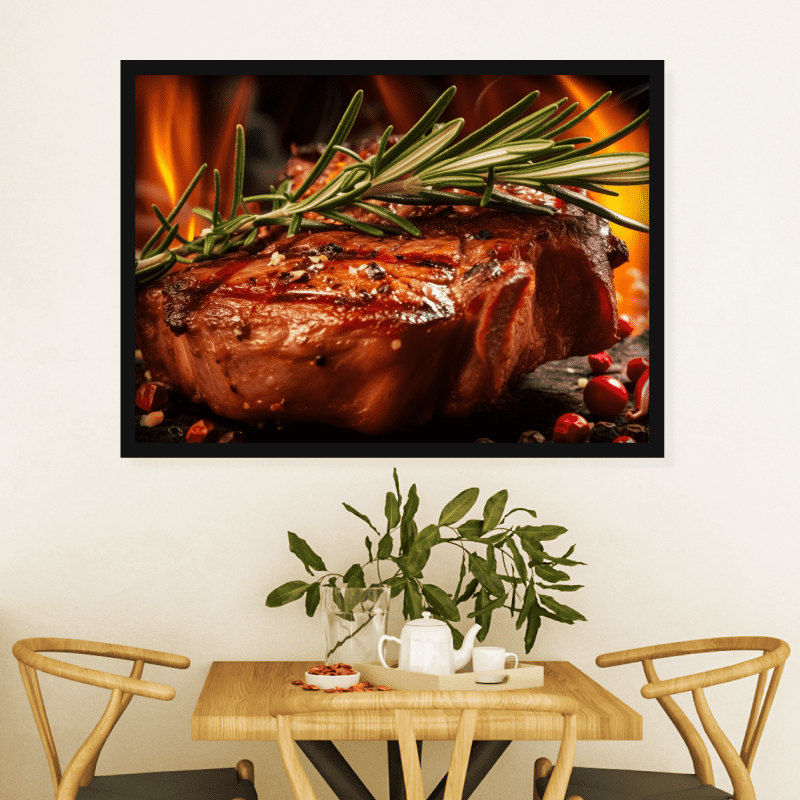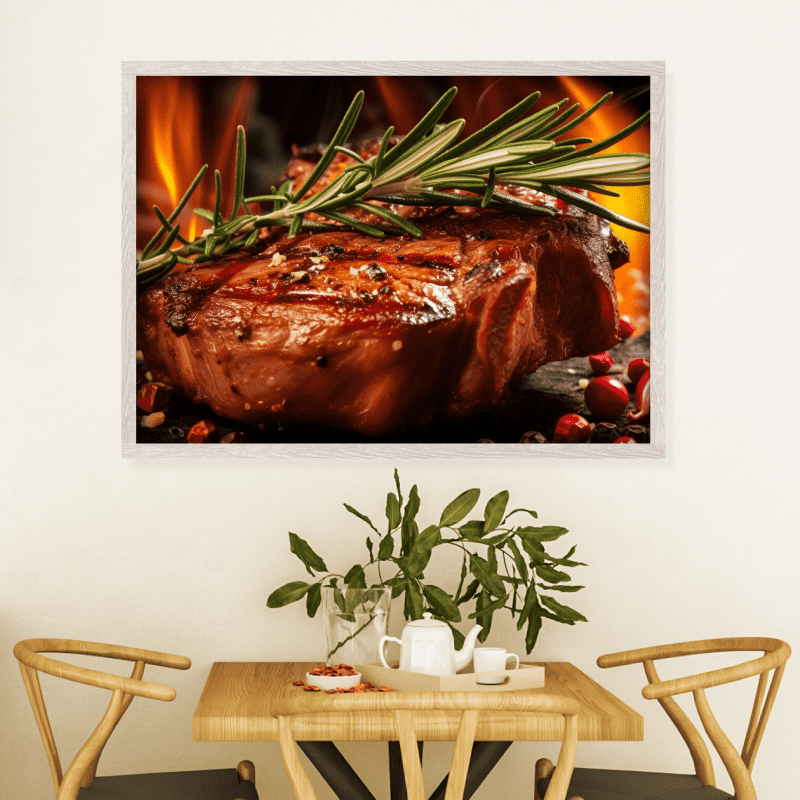 ¡A la parrilla! Esta impresión sobre lienzo captura la esencia de un filete en su punto perfecto. La vista se deleita con la riqueza de colores y texturas, mientras que el olfato casi puede percibir el aroma ahumado y especiado de la carne asada.