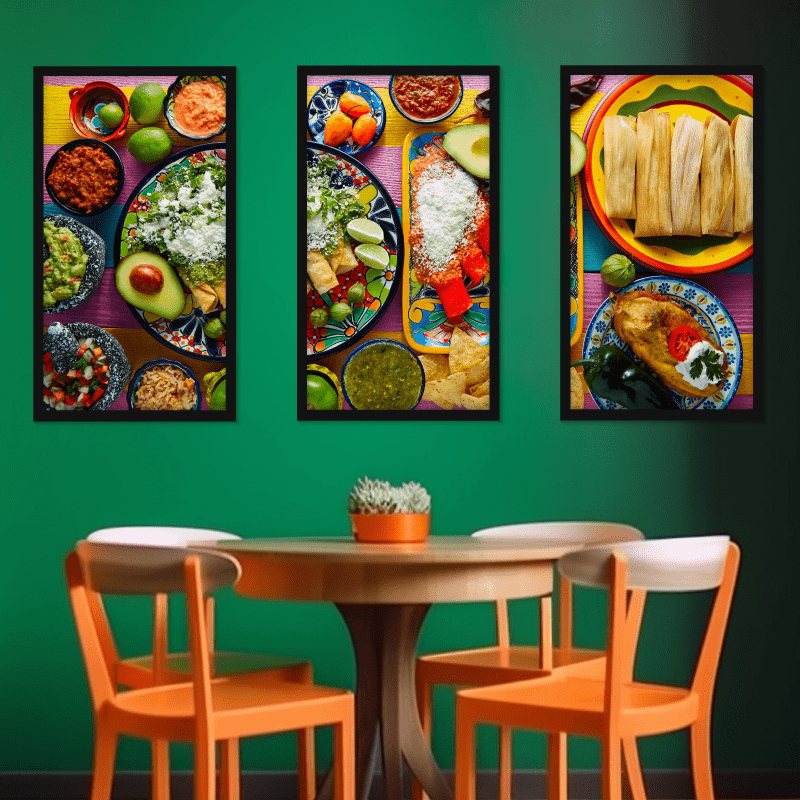¡Deliciosa gastronomía! Estas impresiones sobre lienzo muestran la esencia mexicana a través de algunos platillos tradicionales; que te invitan a un festín visual, celebrando su riqueza cultural.
