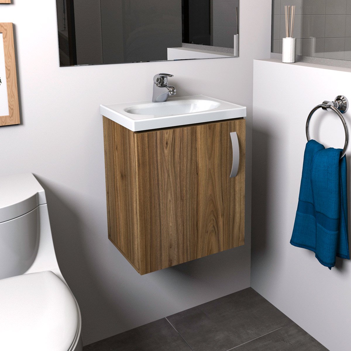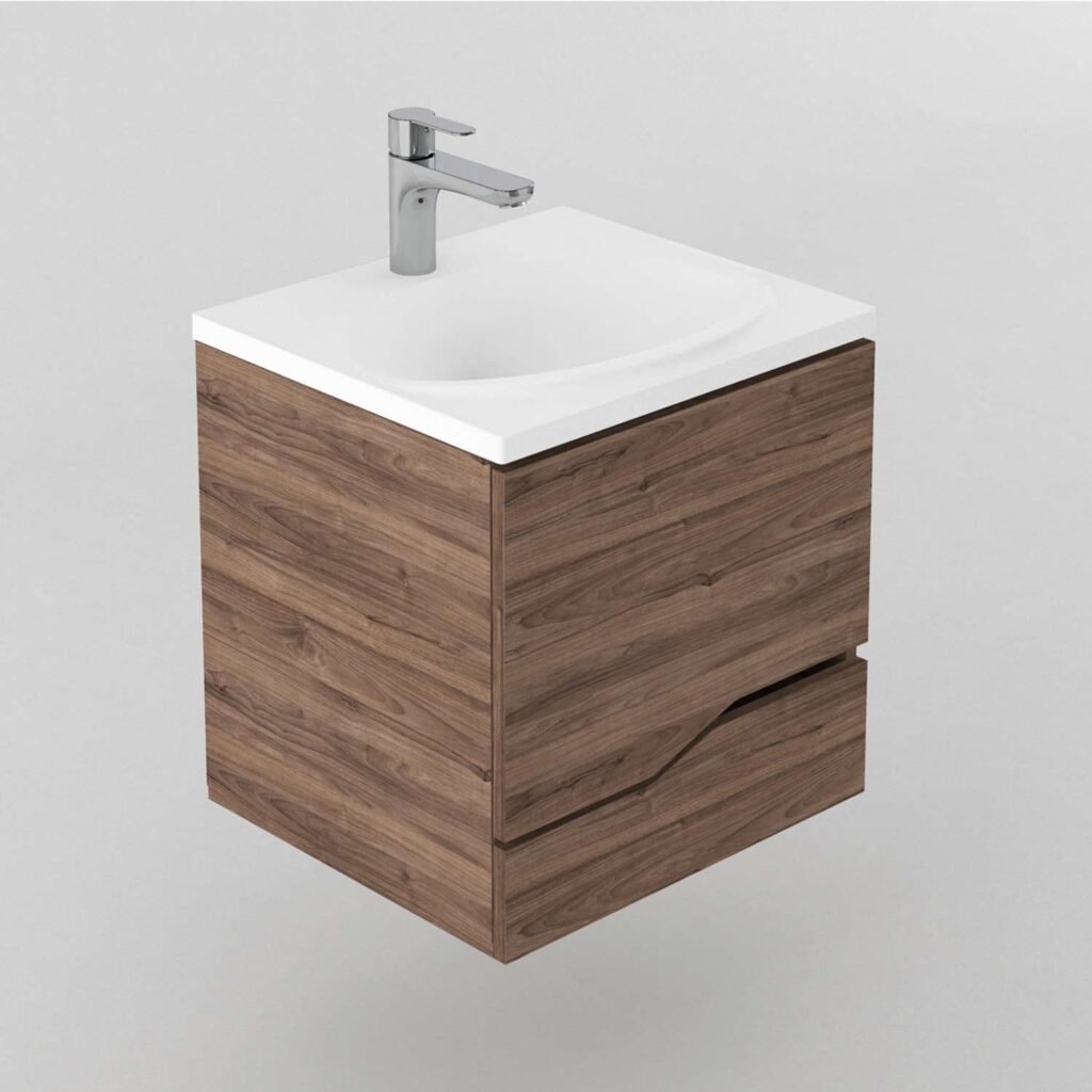 Este mueble de baño flotante es una excelente opción para aquellos que buscan una solución moderna y elegante para su baño. El tamaño del mueble es de 48X42x43 cm, con una profundidad de 42cm, lo que lo hace ideal para baños de tamaño medio. El material utilizado en su construcción es aglomerado DMP, con un grosor de 15mm, lo que asegura su durabilidad y resistencia, lavamanos en mármol sintético para mayot durabilidad y resistencia, tiene dos puertas, ambas con cierre lento, Las puertas cuentan con bisagras de alta calidad que garantizan su estabilidad y durabilidad. cada puerta cuenta con una manija metalica permitiendo una fácil apertura y cierre de las puertas
